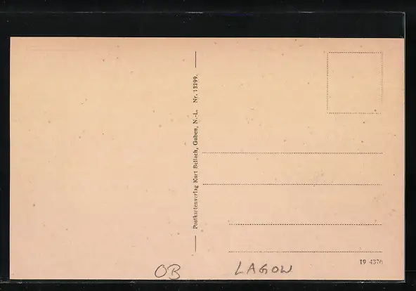 Personenbezogene Daten auf der Rückseite der Karte wurden durch blauen Textmarker unkenntlich gemacht. Die blauen Stellen sind auf die Vorderseite durchgeweicht und wirken sich negativ auf das Postkartenfoto aus