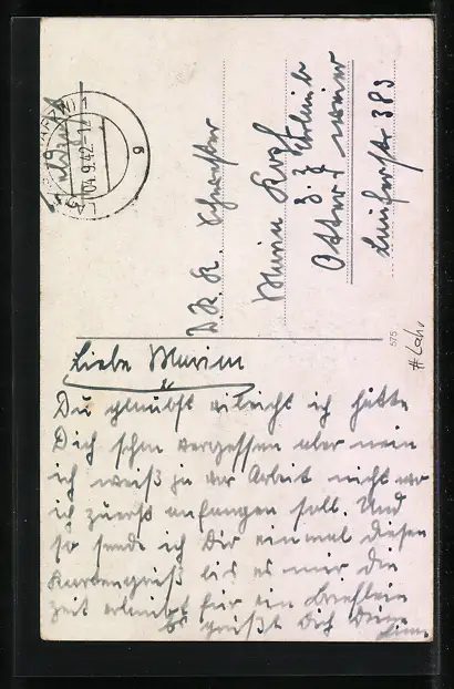 Personenbezogene Daten auf der Rückseite der Karte wurden durch blauen Textmarker unkenntlich gemacht. Die blauen Stellen sind auf die Vorderseite durchgeweicht und wirken sich negativ auf das Postkartenfoto aus