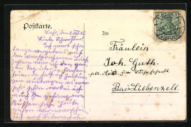 Personenbezogene Daten auf der Rückseite der Karte wurden durch blauen Textmarker unkenntlich gemacht. Die blauen Stellen sind auf die Vorderseite durchgeweicht und wirken sich negativ auf das Postkartenfoto aus