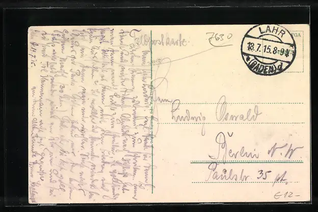 Personenbezogene Daten auf der Rückseite der Karte wurden durch blauen Textmarker unkenntlich gemacht. Die blauen Stellen sind auf die Vorderseite durchgeweicht und wirken sich negativ auf das Postkartenfoto aus