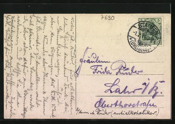 Personenbezogene Daten auf der Rückseite der Karte wurden durch blauen Textmarker unkenntlich gemacht. Die blauen Stellen sind auf die Vorderseite durchgeweicht und wirken sich negativ auf das Postkartenfoto aus