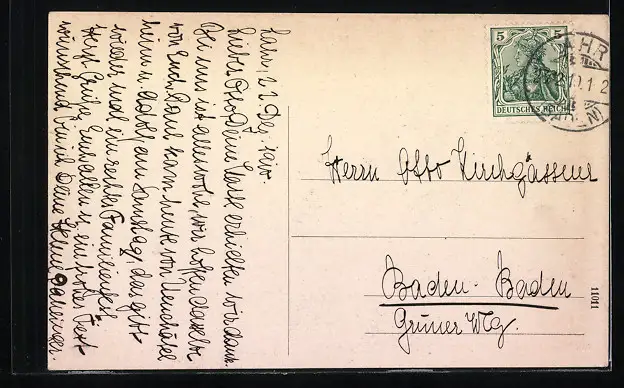 Personenbezogene Daten auf der Rückseite der Karte wurden durch blauen Textmarker unkenntlich gemacht. Die blauen Stellen sind auf die Vorderseite durchgeweicht und wirken sich negativ auf das Postkartenfoto aus
