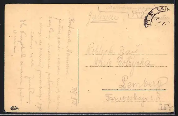 Personenbezogene Daten auf der Rückseite der Karte wurden durch blauen Textmarker unkenntlich gemacht. Die blauen Stellen sind auf die Vorderseite durchgeweicht und wirken sich negativ auf das Postkartenfoto aus