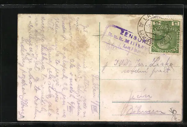 Personenbezogene Daten auf der Rückseite der Karte wurden durch blauen Textmarker unkenntlich gemacht. Die blauen Stellen sind auf die Vorderseite durchgeweicht und wirken sich negativ auf das Postkartenfoto aus