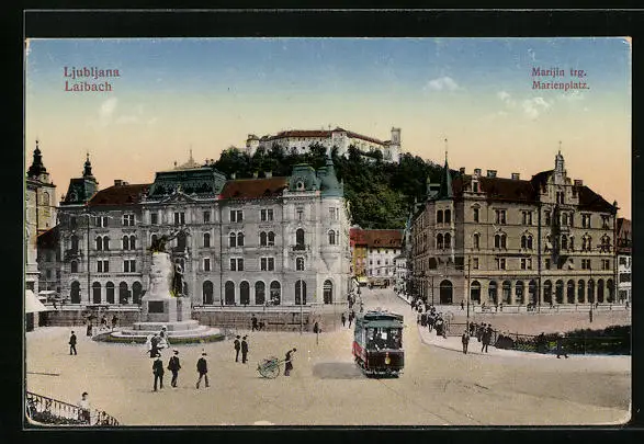 AK Laibach, Strassenbahn auf dem Marienplatz