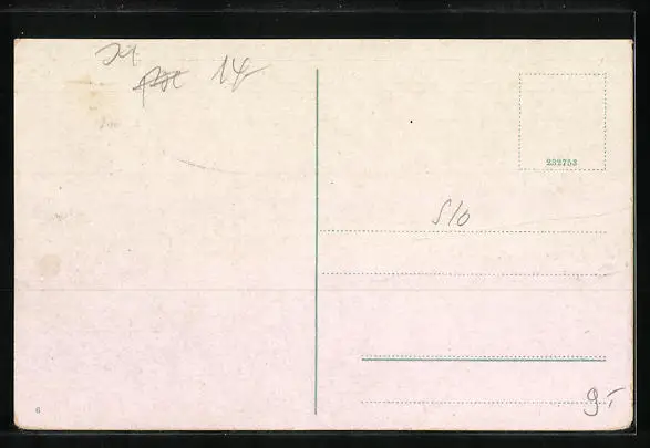 Personenbezogene Daten auf der Rückseite der Karte wurden durch blauen Textmarker unkenntlich gemacht. Die blauen Stellen sind auf die Vorderseite durchgeweicht und wirken sich negativ auf das Postkartenfoto aus