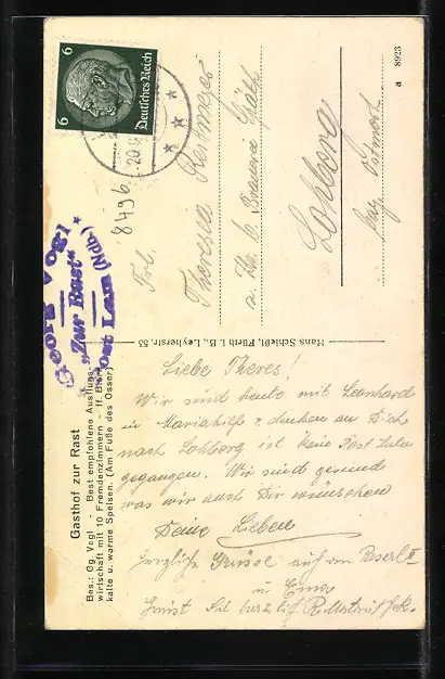Personenbezogene Daten auf der Rückseite der Karte wurden durch blauen Textmarker unkenntlich gemacht. Die blauen Stellen sind auf die Vorderseite durchgeweicht und wirken sich negativ auf das Postkartenfoto aus