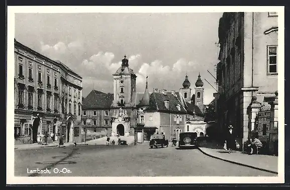 AK Lambach /O.-Oe., Strassenpartie mit Gebäudeansicht