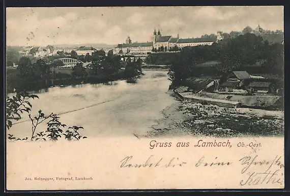 AK Lambach /Ob.-Oest., Uferpartie mit Stift