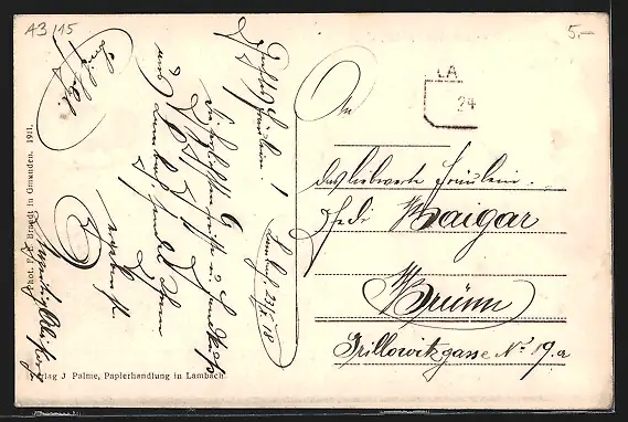 Personenbezogene Daten auf der Rückseite der Karte wurden durch blauen Textmarker unkenntlich gemacht. Die blauen Stellen sind auf die Vorderseite durchgeweicht und wirken sich negativ auf das Postkartenfoto aus