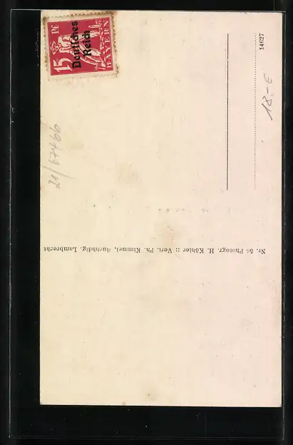 Personenbezogene Daten auf der Rückseite der Karte wurden durch blauen Textmarker unkenntlich gemacht. Die blauen Stellen sind auf die Vorderseite durchgeweicht und wirken sich negativ auf das Postkartenfoto aus
