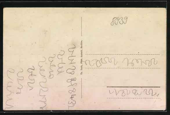Personenbezogene Daten auf der Rückseite der Karte wurden durch blauen Textmarker unkenntlich gemacht. Die blauen Stellen sind auf die Vorderseite durchgeweicht und wirken sich negativ auf das Postkartenfoto aus