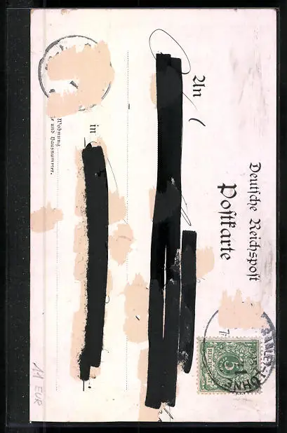 Personenbezogene Daten auf der Rückseite der Karte wurden durch blauen Textmarker unkenntlich gemacht. Die blauen Stellen sind auf die Vorderseite durchgeweicht und wirken sich negativ auf das Postkartenfoto aus