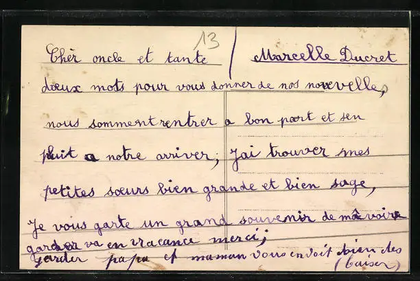 Personenbezogene Daten auf der Rückseite der Karte wurden durch blauen Textmarker unkenntlich gemacht. Die blauen Stellen sind auf die Vorderseite durchgeweicht und wirken sich negativ auf das Postkartenfoto aus