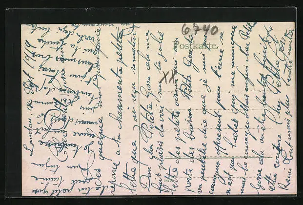 Personenbezogene Daten auf der Rückseite der Karte wurden durch blauen Textmarker unkenntlich gemacht. Die blauen Stellen sind auf die Vorderseite durchgeweicht und wirken sich negativ auf das Postkartenfoto aus