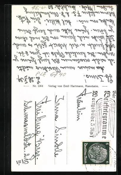 Personenbezogene Daten auf der Rückseite der Karte wurden durch blauen Textmarker unkenntlich gemacht. Die blauen Stellen sind auf die Vorderseite durchgeweicht und wirken sich negativ auf das Postkartenfoto aus