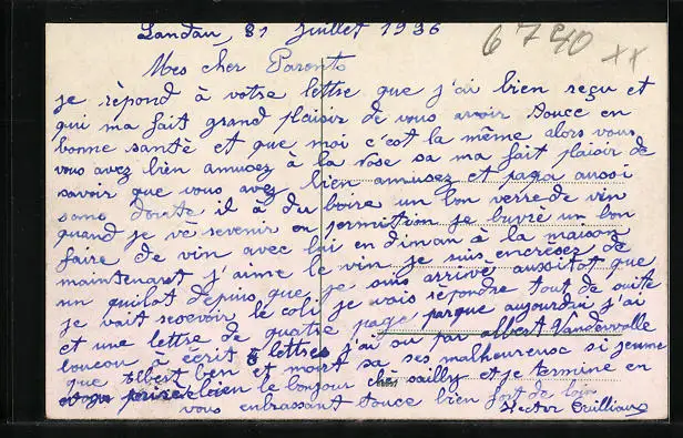 Personenbezogene Daten auf der Rückseite der Karte wurden durch blauen Textmarker unkenntlich gemacht. Die blauen Stellen sind auf die Vorderseite durchgeweicht und wirken sich negativ auf das Postkartenfoto aus