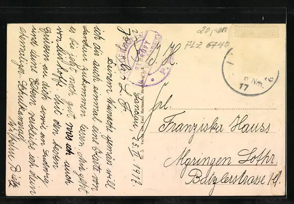 gelaufen 1917, Briefmarke entfernt, Eckknick oben re., guter Zustand