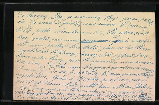 Personenbezogene Daten auf der Rückseite der Karte wurden durch blauen Textmarker unkenntlich gemacht. Die blauen Stellen sind auf die Vorderseite durchgeweicht und wirken sich negativ auf das Postkartenfoto aus
