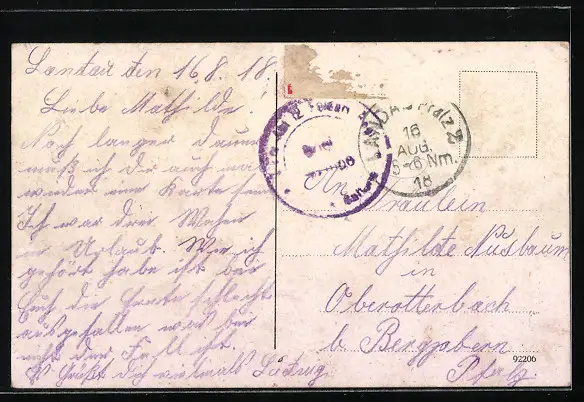 alte Ansichtskarte, gelaufen 1918, rückseitig Oberflächenschaden, Eckknick oben li., guter Zustand