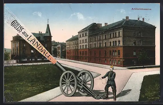 AK Landau / Pfalz, Artilleriekaserne mit Soldat der Kanone zündet