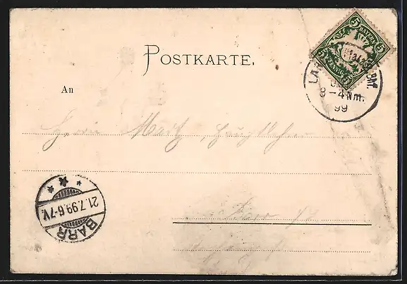 alte Ansichtskarte, gelaufen 1899, Bugspur oben li., guter Zustand