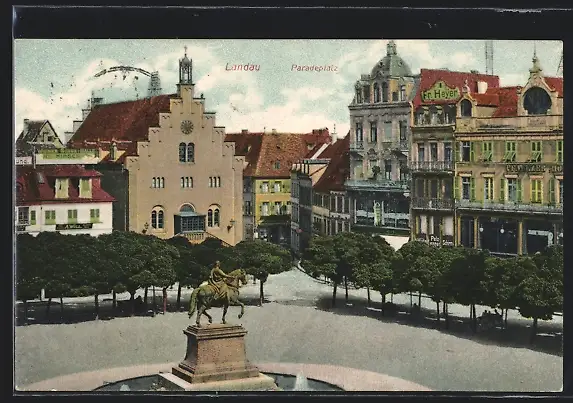 AK Landau / Pfalz, Paradeplatz mit Geschäften und Denkmal