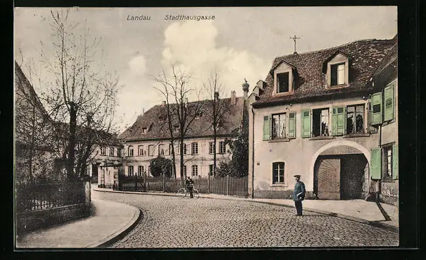 AK Landau, Stadthausgasse mit Uniformiertem