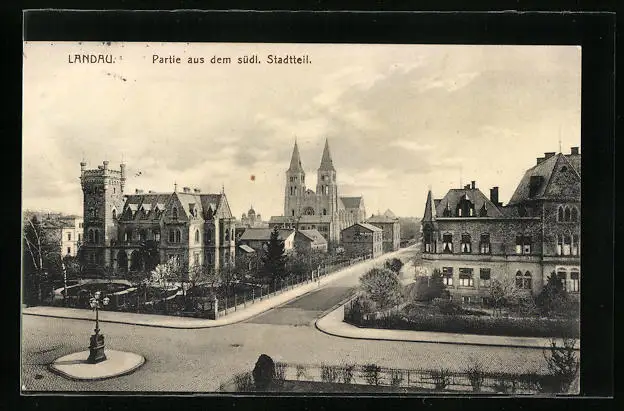 AK Landau, Strassenpartie im südlichen Stadtteil, Blick zur Kirche