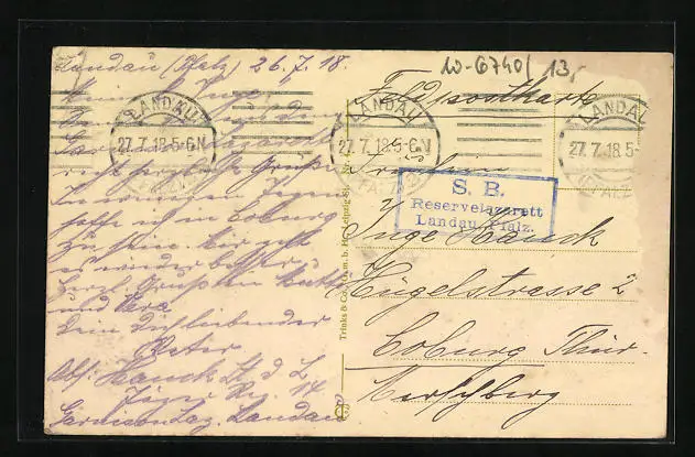 gelaufen als Feldpost 1918, rückseitig Oberflächenschaden, guter Zustand
