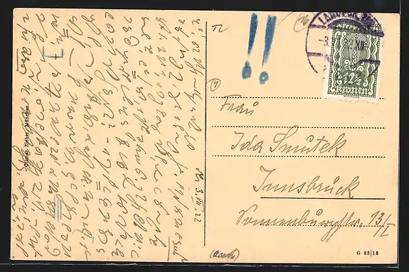Personenbezogene Daten auf der Rückseite der Karte wurden durch blauen Textmarker unkenntlich gemacht. Die blauen Stellen sind auf die Vorderseite durchgeweicht und wirken sich negativ auf das Postkartenfoto aus