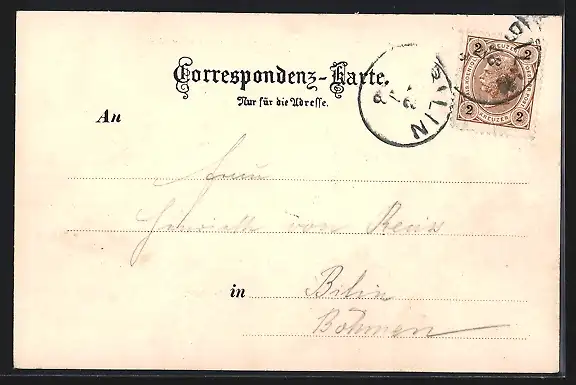 Personenbezogene Daten auf der Rückseite der Karte wurden durch blauen Textmarker unkenntlich gemacht. Die blauen Stellen sind auf die Vorderseite durchgeweicht und wirken sich negativ auf das Postkartenfoto aus