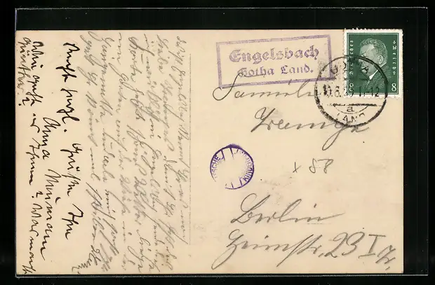 Personenbezogene Daten auf der Rückseite der Karte wurden durch blauen Textmarker unkenntlich gemacht. Die blauen Stellen sind auf die Vorderseite durchgeweicht und wirken sich negativ auf das Postkartenfoto aus