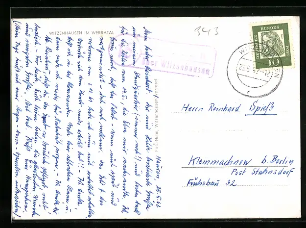 Personenbezogene Daten auf der Rückseite der Karte wurden durch blauen Textmarker unkenntlich gemacht. Die blauen Stellen sind auf die Vorderseite durchgeweicht und wirken sich negativ auf das Postkartenfoto aus