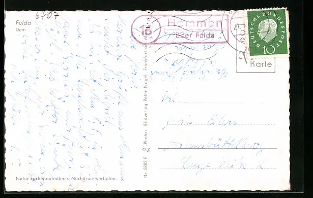 Personenbezogene Daten auf der Rückseite der Karte wurden durch blauen Textmarker unkenntlich gemacht. Die blauen Stellen sind auf die Vorderseite durchgeweicht und wirken sich negativ auf das Postkartenfoto aus