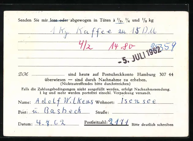 Personenbezogene Daten auf der Rückseite der Karte wurden durch blauen Textmarker unkenntlich gemacht. Die blauen Stellen sind auf die Vorderseite durchgeweicht und wirken sich negativ auf das Postkartenfoto aus