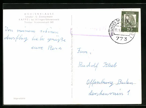 Personenbezogene Daten auf der Rückseite der Karte wurden durch blauen Textmarker unkenntlich gemacht. Die blauen Stellen sind auf die Vorderseite durchgeweicht und wirken sich negativ auf das Postkartenfoto aus