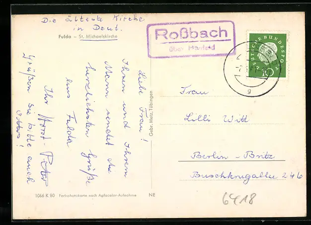 Personenbezogene Daten auf der Rückseite der Karte wurden durch blauen Textmarker unkenntlich gemacht. Die blauen Stellen sind auf die Vorderseite durchgeweicht und wirken sich negativ auf das Postkartenfoto aus