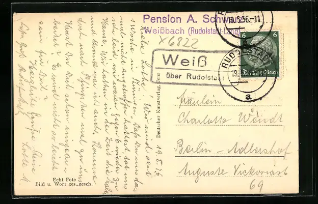 Personenbezogene Daten auf der Rückseite der Karte wurden durch blauen Textmarker unkenntlich gemacht. Die blauen Stellen sind auf die Vorderseite durchgeweicht und wirken sich negativ auf das Postkartenfoto aus