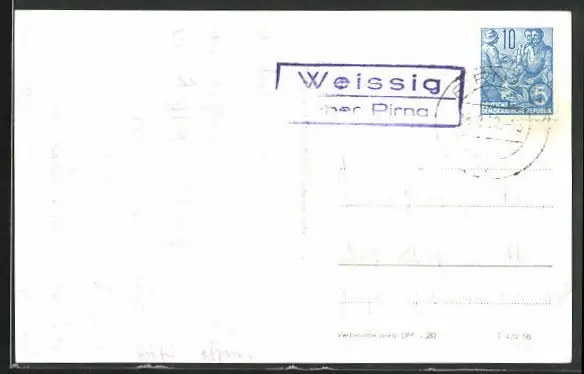 Personenbezogene Daten auf der Rückseite der Karte wurden durch blauen Textmarker unkenntlich gemacht. Die blauen Stellen sind auf die Vorderseite durchgeweicht und wirken sich negativ auf das Postkartenfoto aus