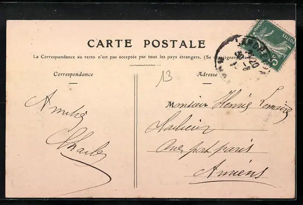 Personenbezogene Daten auf der Rückseite der Karte wurden durch blauen Textmarker unkenntlich gemacht. Die blauen Stellen sind auf die Vorderseite durchgeweicht und wirken sich negativ auf das Postkartenfoto aus
