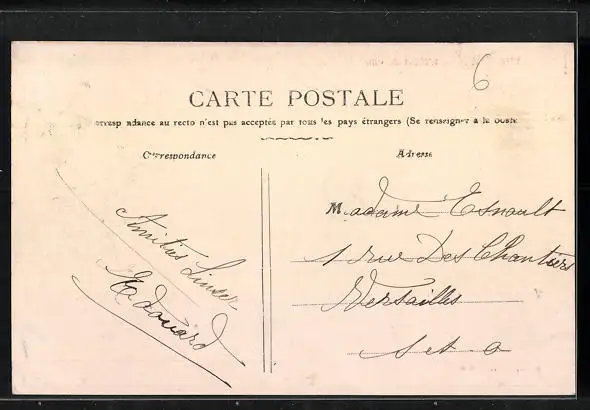 Personenbezogene Daten auf der Rückseite der Karte wurden durch blauen Textmarker unkenntlich gemacht. Die blauen Stellen sind auf die Vorderseite durchgeweicht und wirken sich negativ auf das Postkartenfoto aus