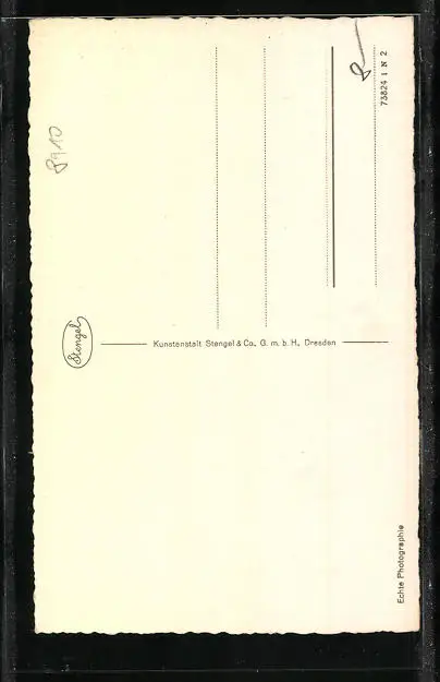 Personenbezogene Daten auf der Rückseite der Karte wurden durch blauen Textmarker unkenntlich gemacht. Die blauen Stellen sind auf die Vorderseite durchgeweicht und wirken sich negativ auf das Postkartenfoto aus