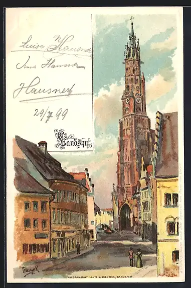 AK Landshut / Isar, Strassenpartie mit Kirche