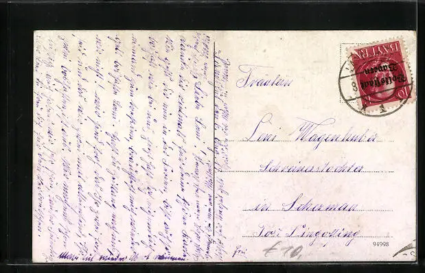 Personenbezogene Daten auf der Rückseite der Karte wurden durch blauen Textmarker unkenntlich gemacht. Die blauen Stellen sind auf die Vorderseite durchgeweicht und wirken sich negativ auf das Postkartenfoto aus
