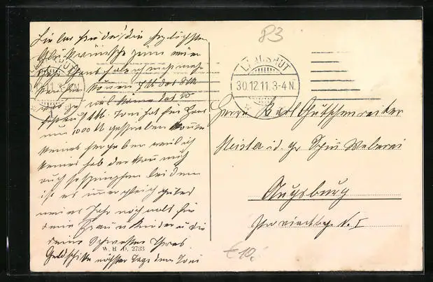 Personenbezogene Daten auf der Rückseite der Karte wurden durch blauen Textmarker unkenntlich gemacht. Die blauen Stellen sind auf die Vorderseite durchgeweicht und wirken sich negativ auf das Postkartenfoto aus