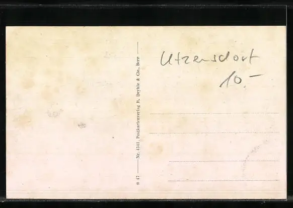 Personenbezogene Daten auf der Rückseite der Karte wurden durch blauen Textmarker unkenntlich gemacht. Die blauen Stellen sind auf die Vorderseite durchgeweicht und wirken sich negativ auf das Postkartenfoto aus