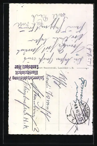 Personenbezogene Daten auf der Rückseite der Karte wurden durch blauen Textmarker unkenntlich gemacht. Die blauen Stellen sind auf die Vorderseite durchgeweicht und wirken sich negativ auf das Postkartenfoto aus