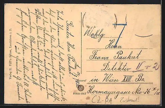 Personenbezogene Daten auf der Rückseite der Karte wurden durch blauen Textmarker unkenntlich gemacht. Die blauen Stellen sind auf die Vorderseite durchgeweicht und wirken sich negativ auf das Postkartenfoto aus