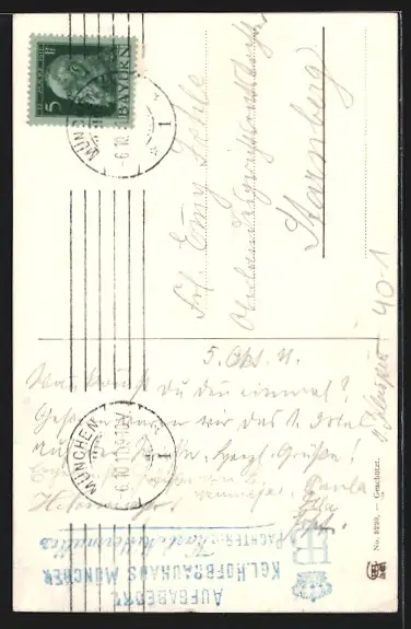 Personenbezogene Daten auf der Rückseite der Karte wurden durch blauen Textmarker unkenntlich gemacht. Die blauen Stellen sind auf die Vorderseite durchgeweicht und wirken sich negativ auf das Postkartenfoto aus